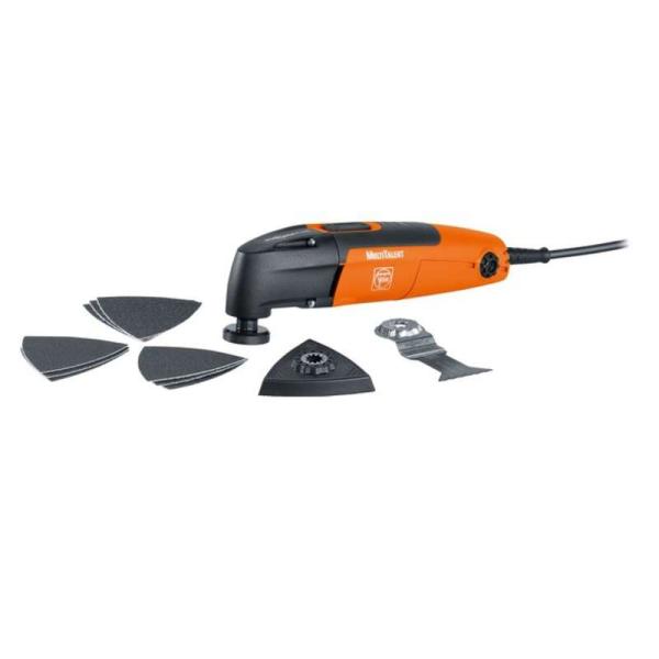 1 FEIN MultiTalent FMT 250 1 sanding pad Sanding sheets, 3 each of grit 80, 120, 180 1 Universal E-Cut saw blade (44 mm) 1 plastic carrying case
