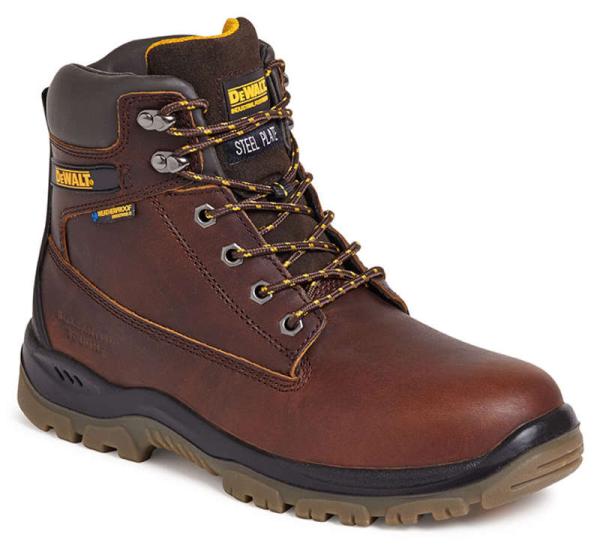 Full grain tan leather upper. Waterproof and breathable Samsung membrane inner lining. Padded tongue and collar for added comfort. Steel toe cap protection and steel midsole protection. PU comfort insole. TPU dual density outsole. A high quality waterproof safety boot from DEWALT.